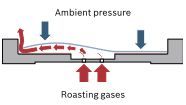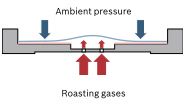 Der Überdruck erhöht sich und die Membran hebt sich an der einen Seite des Ventils bis sich ein Tunnel gebildet hat, durch den die Röstgase nach außen dringen können.