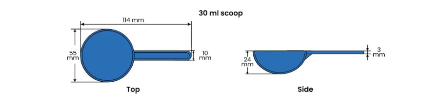 Blauer Dosierlöffel aus Polystyrene. In verschiedenen Größen (1ml bis zu 150ml) ab Lager erhältlich.